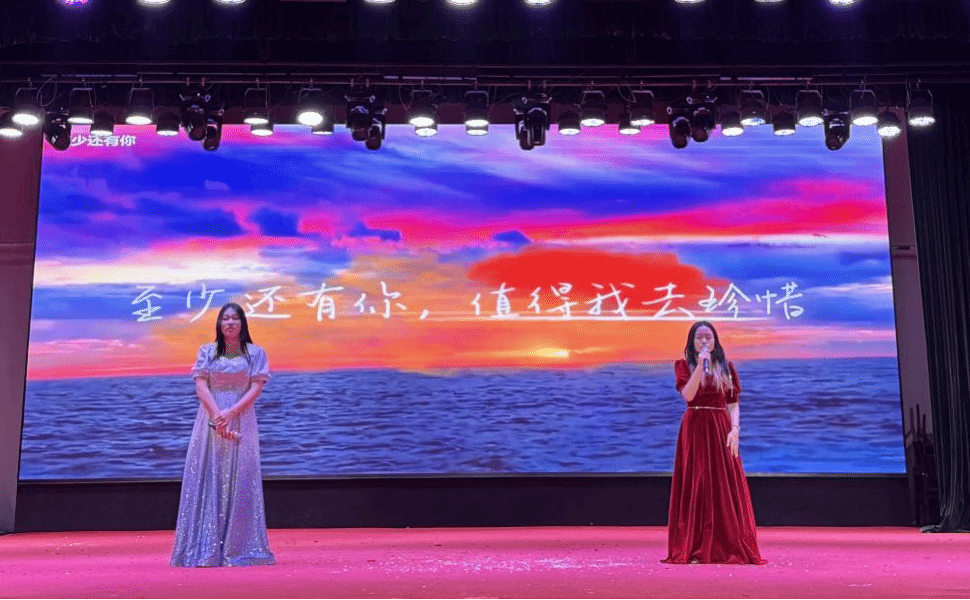 我院刘一童和陈思睿两位女同学联袂演唱《至少还有你》,她们清澈而富有穿透力的嗓音在礼堂中回荡。台下同学们纷举起荧光棒随节奏摇摆,点点星光汇聚成一片璀璨星海,场面温馨而震撼。