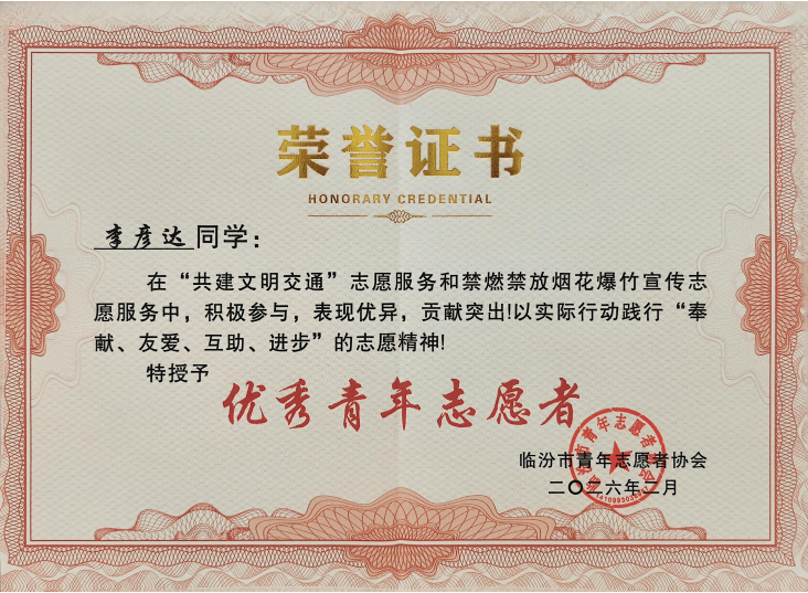 中美材料化学2503李彦达,参加文明交通宣传维护志愿服务,用文明点亮新春,用守护传递平安,获评“优秀青年志愿者”。