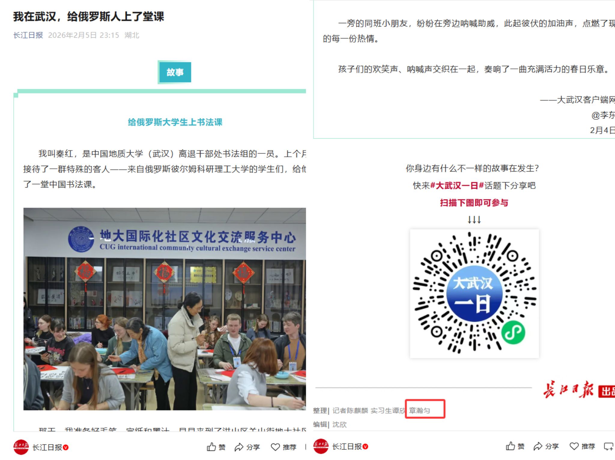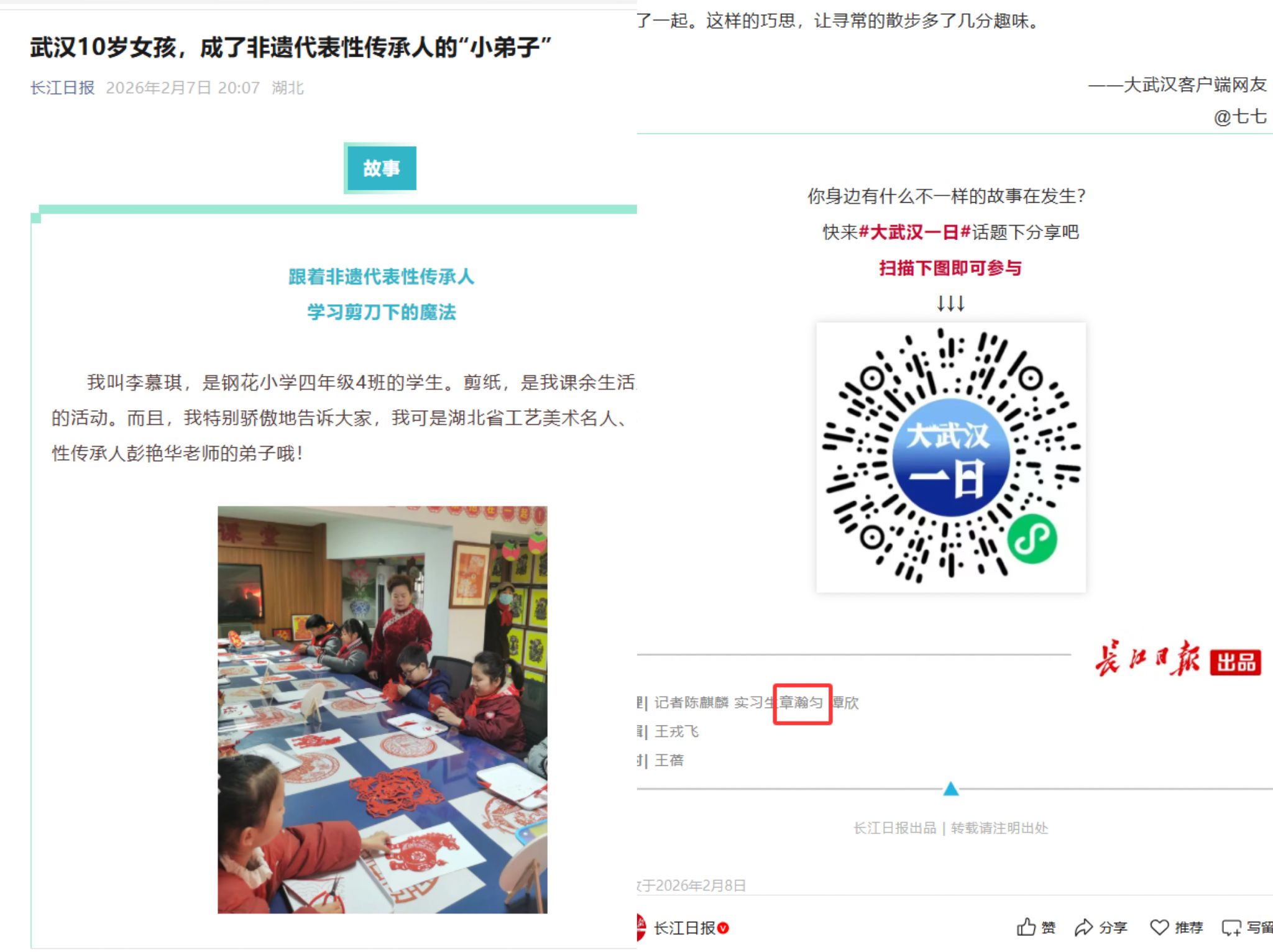 中美电信科学2501章瀚匀,化身中华优秀传统文化“小记者”,用文字生动呈现非遗剪纸、宫灯制作、中国书法等志愿活动,投稿长江日报发表3篇新闻。