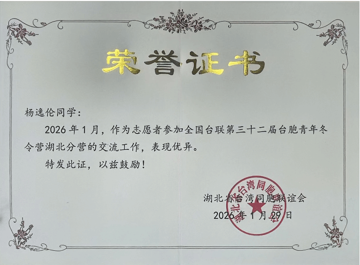 中美材料化学2502杨逸伦,积极参加全国台联第32届台胞青年冬令营湖北分营志愿者活动,在“华中屋脊”的皑皑白雪间热心服务台湾青年们,获得表扬。