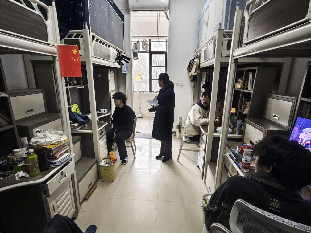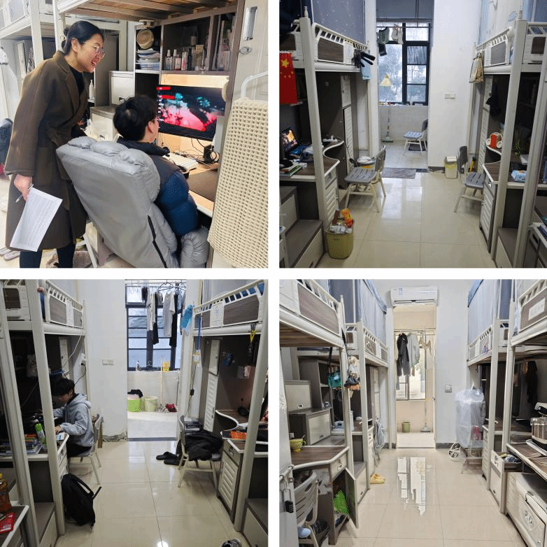 春风送暖,学子归巢。为全面了解学生返校后的思想动态,切实排查寝室安全隐患,营造安全、整洁、文明的住宿环境,3月6日,学院党支部书记史理、院长宋少云、副书记王亮、辅导员柴小婷、办公室董仕琴、教学秘书叶玲,与班主任一起,分批次深入学生寝室,开展走访慰问与安全卫生检查工作。