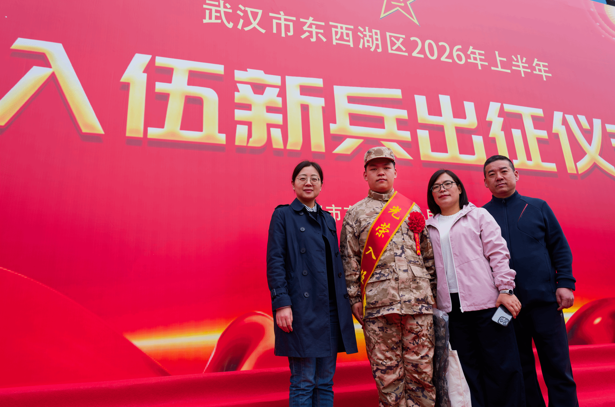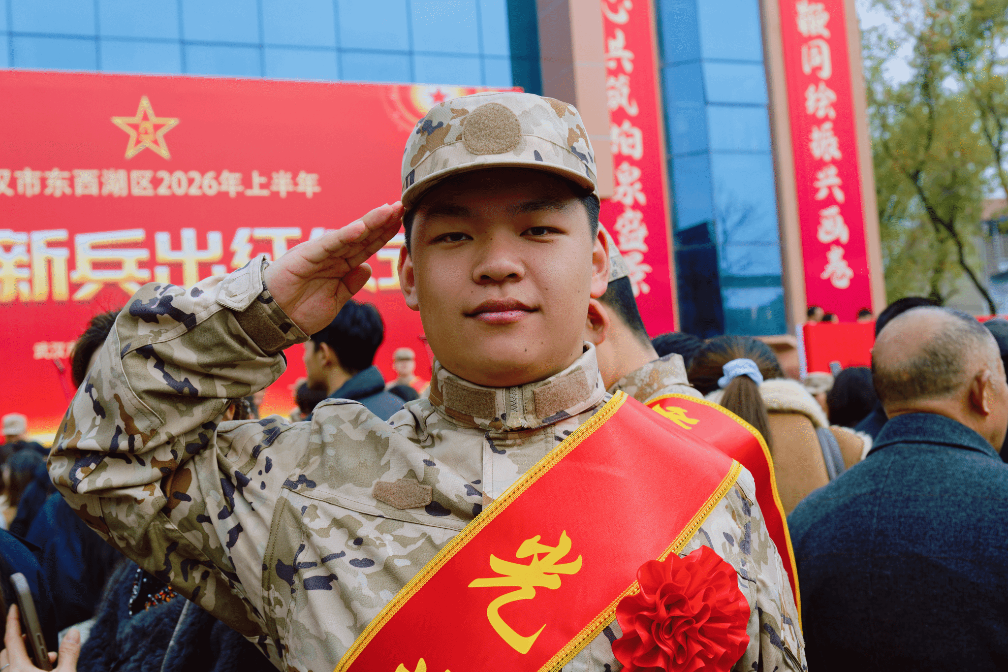 3月19日,在东西湖武装部举行的入伍新兵出征仪式上,来自匹兹堡学院材料化学2501班的李松尚同学,身着崭新的作训服,肩披“光荣入伍”的鲜红绶带,身姿挺拔,眼神坚定,脸上洋溢着自豪与喜悦,光荣地成为我校2026年春季征兵中成功走军的9名学子之一。