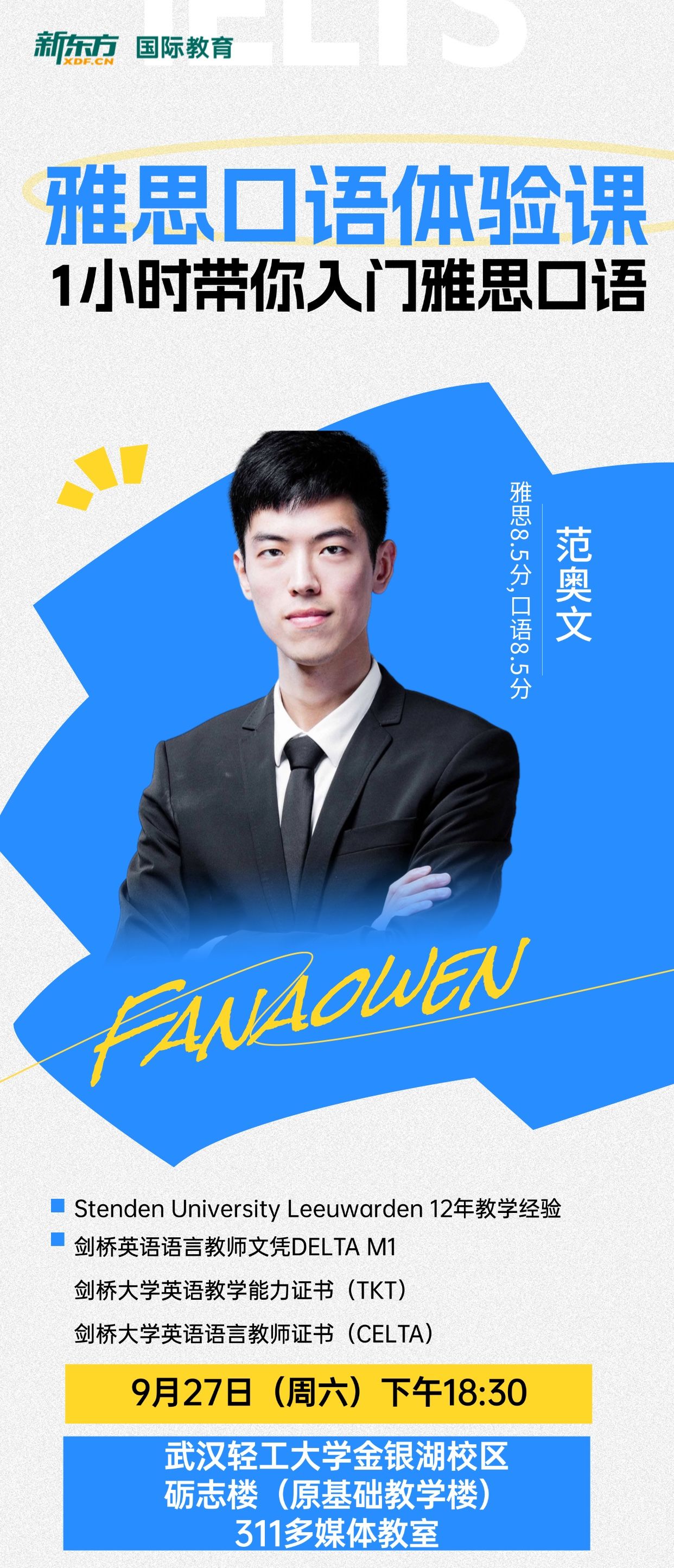 学院邀资深教师范奥文(雅思及口语8.5分,持多个国际英语教学证书,12年教龄)开设雅思口语体验课,1小时助你入门。欢迎参加!